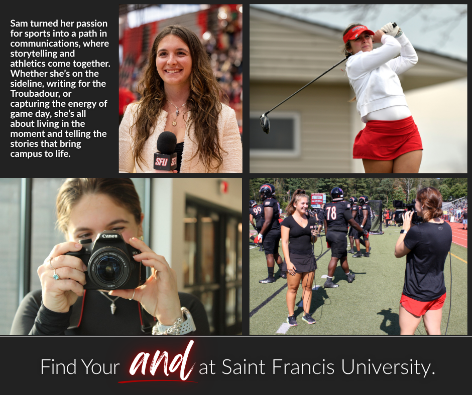 At Saint Francis University, Sam has embraced the opportunity to be both a student-athlete and a storyteller—balancing academics, athletics, and hands-on experience in a way that reflects the University’s mission.
