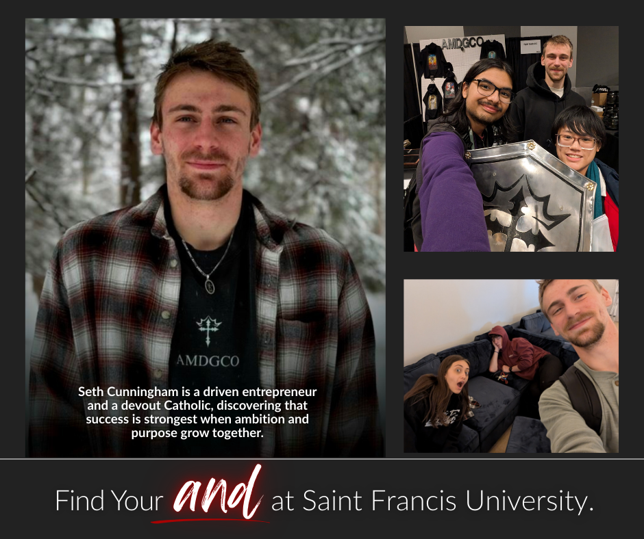 When Seth Cunningham of Ebensburg, Pa. was just a freshman at Saint Francis University in 2024, he considered dropping out of school to pursue his dream of becoming an entrepreneur and business owner. Feeling like college just wasn’t what he needed, he wanted to jump straight into the next phase of his life – growing his online businesses and finding new pursuits to pay his bills. But then he was introduced to a core group of students in Campus Ministry, and everything instantly clicked.