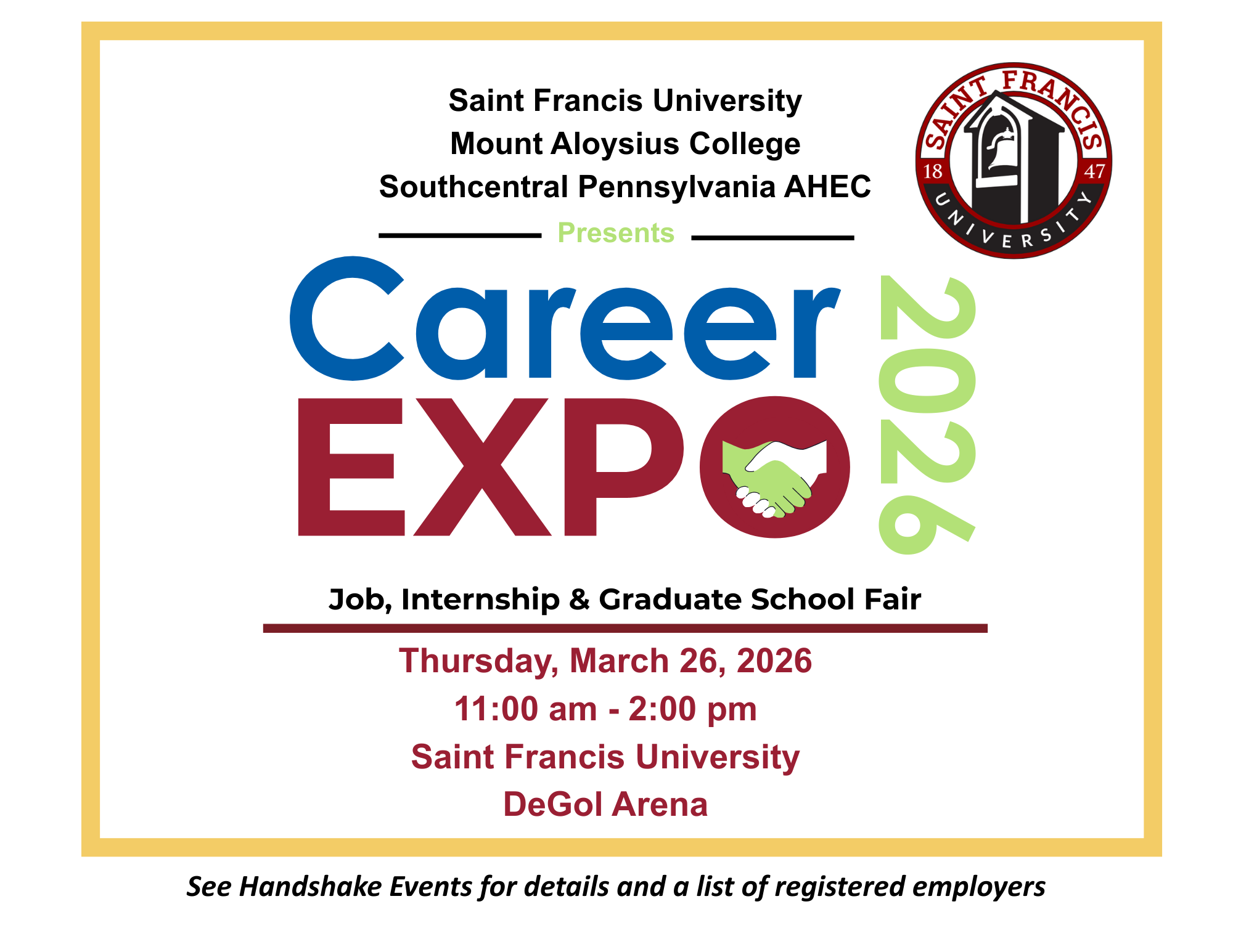 Career Expo 2026 is an in-person recruiting event hosted by Saint Francis University that connects SFU students from all majors with employers and graduate programs offering opportunities in employment, internships, professional experiences, and continued education.